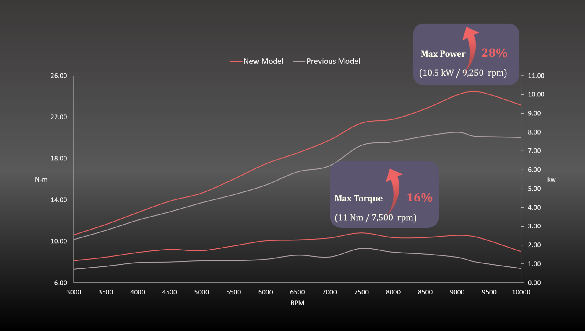 Power upgradeThe NHX features a newly developed 4-valve, liquid-cooled powertrain. Maximum horsepower increases to 10.5 kW, while torque rises to 11 Nm. This upgrade improves cooling efficiency and delivers a significant boost in performance.